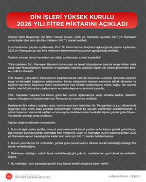 Diyanet İşleri Başkanlığı Din İşleri Yüksek Kurulu, 2026 yılı Ramazan ayından 2027 yılı Ramazan ayına kadar olan süre için fitre miktarını 240 TL olarak belirledi.