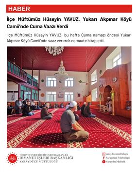 İlçe Müftümüz Hüseyin Yavuz, Yukarı Akpınar Köyü Camii’nde Cuma Vaazı Verdi