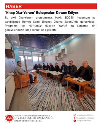 Bu ayki Oku-Yorum programımız, Hakkı BÖCEK hocamızın ev sahipliğinde Merkez Camii Diyanet Okuma Salonu’nda gerçekleşti. Programa İlçe Müftümüz Hüseyin YAVUZ da katılarak din görevlilerimizin kitap sohbetine eşlik etti.