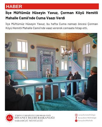 İlçe Müftümüz Hüseyin Yavuz, bu hafta Cuma namazı öncesi Çorman Köyü Hemitli Mahalle Camii’nde vaaz vererek cemaate hitap etti.
