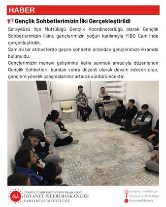 Saraydüzü İlçe Müftülüğü Gençlik Koordinatörlüğü olarak Gençlik Sohbetlerimizin ilkini, gençlerimizin yoğun katılımıyla YİBO Camii’nde gerçekleştirdik.