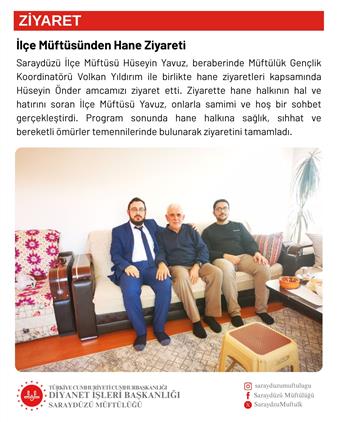 Saraydüzü İlçe Müftüsü Hüseyin Yavuz, beraberinde Müftülük Gençlik Koordinatörü Volkan Yıldırım ile birlikte hane ziyaretleri kapsamında Hüseyin Önder amcamızı ziyaret etti. Ziyarette hane halkının hal ve hatırını soran İlçe Müftüsü Yavuz, onlarla samimi ve hoş bir sohbet gerçekleştirdi. Program sonunda hane halkına sağlık, sıhhat ve bereketli ömürler temennilerinde bulunarak ziyaretini tamamladı.