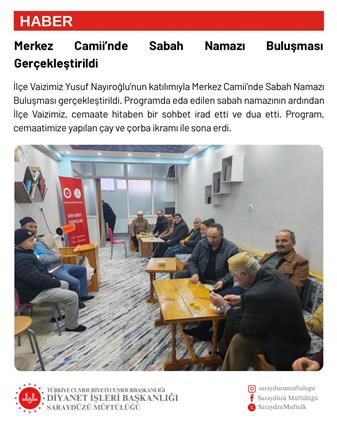 İlçe Vaizimiz Yusuf Nayıroğlu’nun katılımıyla Merkez Camii’nde Sabah Namazı Buluşması gerçekleştirildi. Programda eda edilen sabah namazının ardından İlçe Vaizimiz, cemaate hitaben bir sohbet irad etti ve dua etti. Program, cemaatimize yapılan çay ve çorba ikramı ile sona erdi.