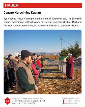 İlçe Vaizimiz Yusuf Nayıroğlu, merhum İsmail Sütçü’nün oğlu İsa Sütçü’nün cenaze merasimine katılarak vaaz etti ve cenaze namazını kıldırdı. Merhuma Allah’tan rahmet; kederli ailesine ve yakınlarına sabır ve başsağlığı dileriz.