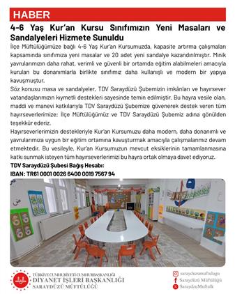 Söz konusu masa ve sandalyeler, TDV Saraydüzü Şubemizin imkânları ve hayırsever vatandaşlarımızın kıymetli destekleri sayesinde temin edilmiştir. Bu hayra vesile olan, maddi ve manevi katkılarıyla TDV Saraydüzü Şubemize güvenerek destek veren tüm hayırseverlerimize; İlçe Müftülüğümüz ve TDV Saraydüzü Şubemiz adına gönülden teşekkür ederiz.