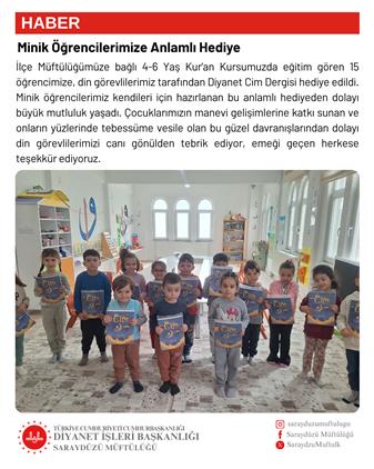 İlçe Müftülüğümüze bağlı 4-6 Yaş Kur’an Kursumuzda eğitim gören 15 öğrencimize, din görevlilerimiz tarafından Diyanet Cim Dergisi hediye edildi. Minik öğrencilerimiz kendileri için hazırlanan bu anlamlı hediyeden dolayı büyük mutluluk yaşadı. Çocuklarımızın manevi gelişimlerine katkı sunan ve onların yüzlerinde tebessüme vesile olan bu güzel davranışlarından dolayı din görevlilerimizi canı gönülden tebrik ediyor, emeği geçen herkese teşekkür ediyoruz.