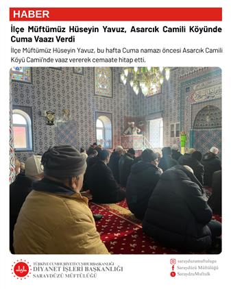 İlçe Müftümüz Hüseyin Yavuz, bu hafta Cuma namazı öncesi Asarcık Camili Köyü Camii’nde vaaz vererek cemaate hitap etti.