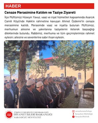 İlçe Müftümüz Hüseyin Yavuz, vaaz ve irşat hizmetleri kapsamında Asarcık Camili Köyü’nde Hakk’ın rahmetine kavuşan Ahmet Özdemir’in cenaze merasimine katıldı. Merasimde vaaz ve irşatta bulunan Müftümüz, merhumun ailesine ve yakınlarına taziyelerini ileterek başsağlığı dileklerinde bulundu. Rabbimiz, merhuma ve tüm geçmişlerimize rahmet eylesin; ailesine ve sevenlerine sabır ihsan eylesin.