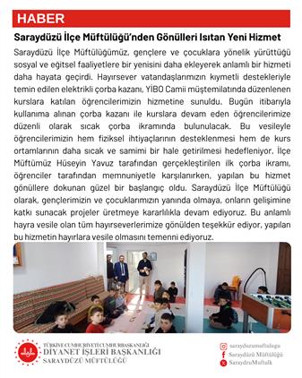 Saraydüzü İlçe Müftülüğümüz, gençlere ve çocuklara yönelik yürüttüğü sosyal ve eğitsel faaliyetlere bir yenisini daha ekleyerek anlamlı bir hizmeti daha hayata geçirdi. Hayırsever vatandaşlarımızın kıymetli destekleriyle temin edilen elektrikli çorba kazanı, YİBO Camii müştemilatında düzenlenen kurslara katılan öğrencilerimizin hizmetine sunuldu. Bugün itibarıyla kullanıma alınan çorba kazanı ile kurslara devam eden öğrencilerimize düzenli olarak sıcak çorba ikramında bulunulacak. Bu vesileyle öğrencilerimizin hem fiziksel ihtiyaçlarının desteklenmesi hem de kurs ortamlarının daha sıcak ve samimi bir hale getirilmesi hedefleniyor.