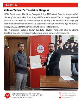 YİBO Camii İmam Hatibi ve Saraydüzü İlçe Müftülüğü Gençlik Koordinatörü olarak görev yapmakta iken Konya ili Karatay ilçesine Müezzin Kayyım olarak atanan Volkan Yıldırım, ilçemizde görev yaptığı süre boyunca başta gençlik hizmetleri olmak üzere gayretli ve başarılı çalışmaları nedeniyle İlçe Müftümüz Hüseyin YAVUZ tarafından teşekkür belgesi ile taltif edildi.